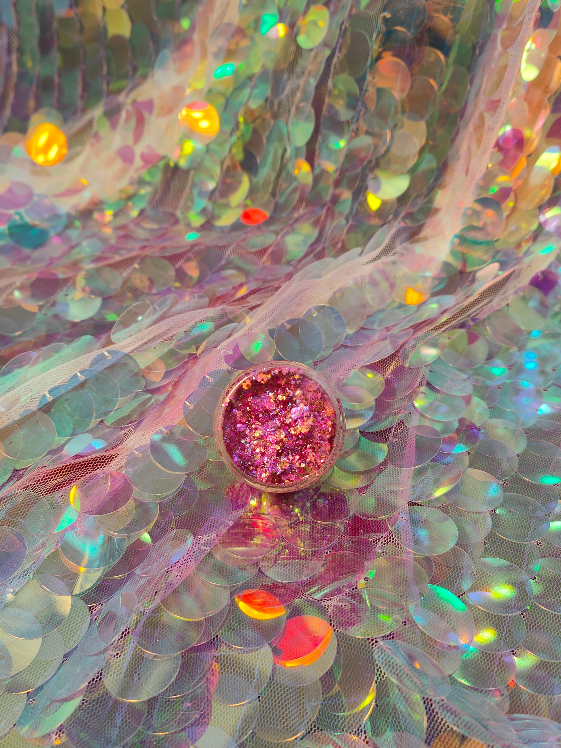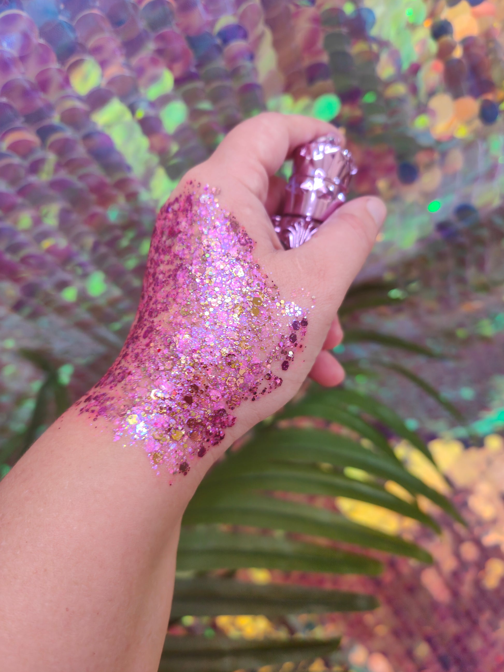 Ingredients: Chunky Cosmetic Grade Glitter, Aqua, Cellulose, Dimethicone, Acrylates Copolymer, DMDM Hydantoin.