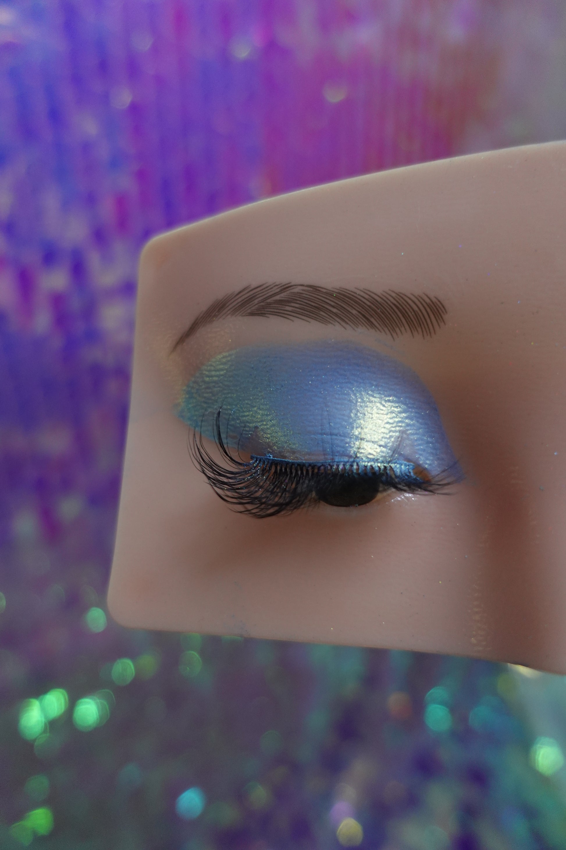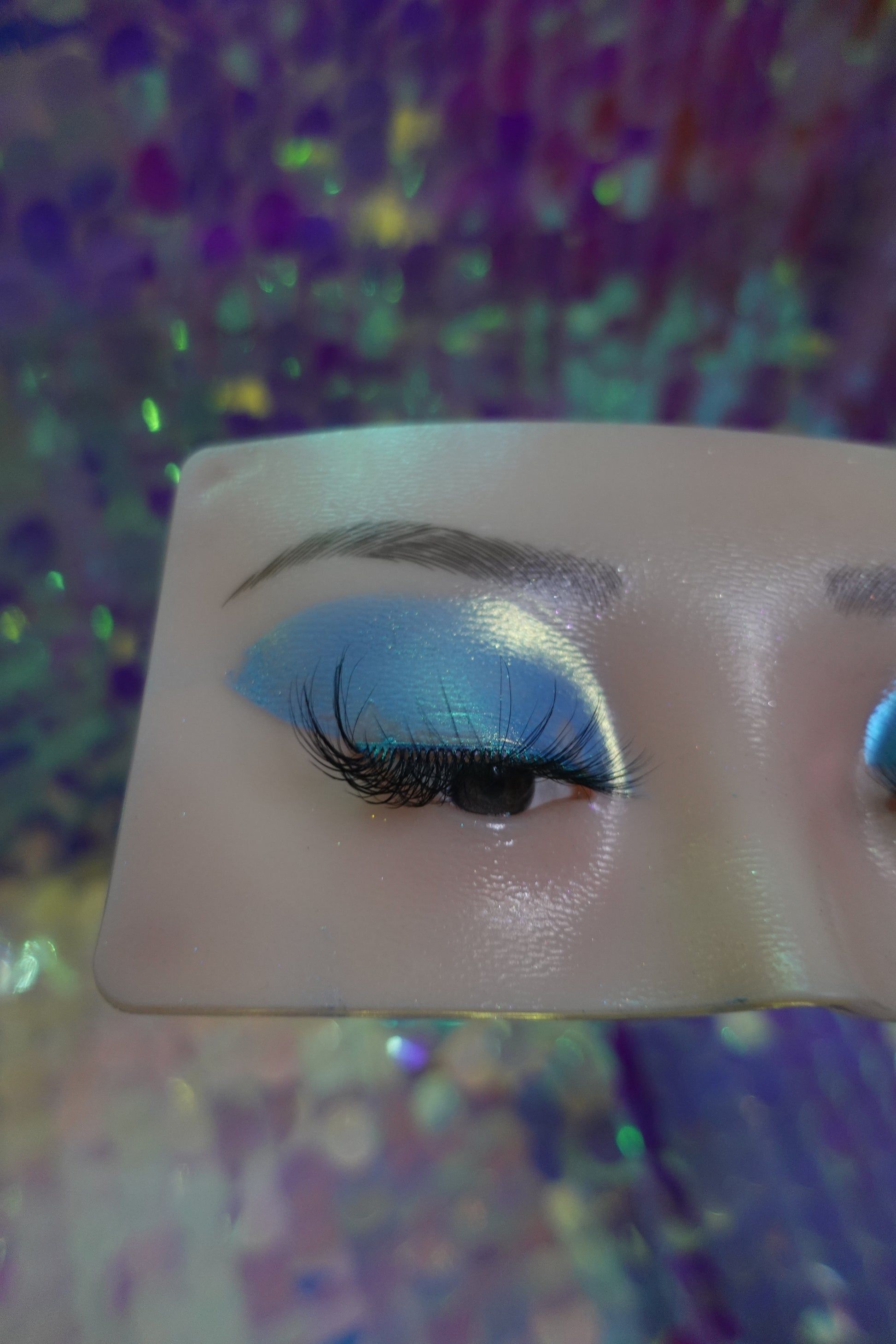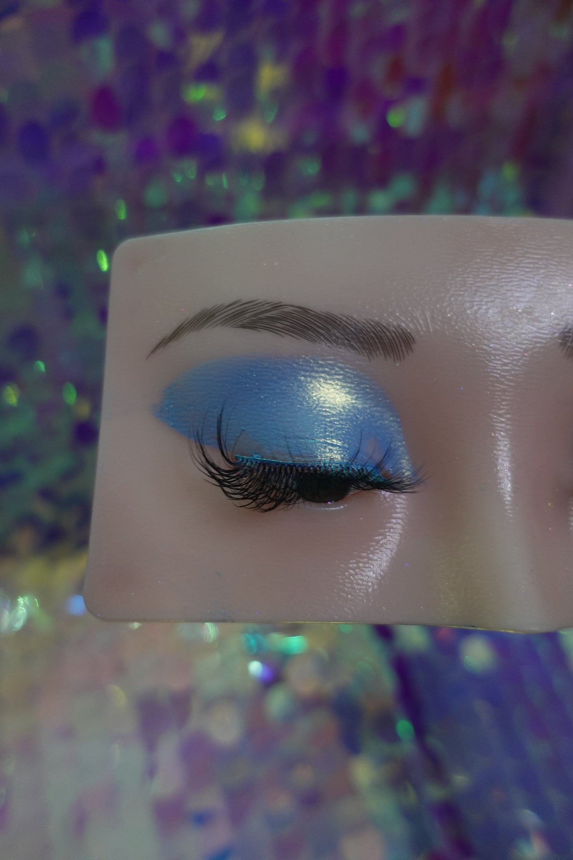 Striking baby blue eyeshadow twith flashes of golden light and a whisper of green