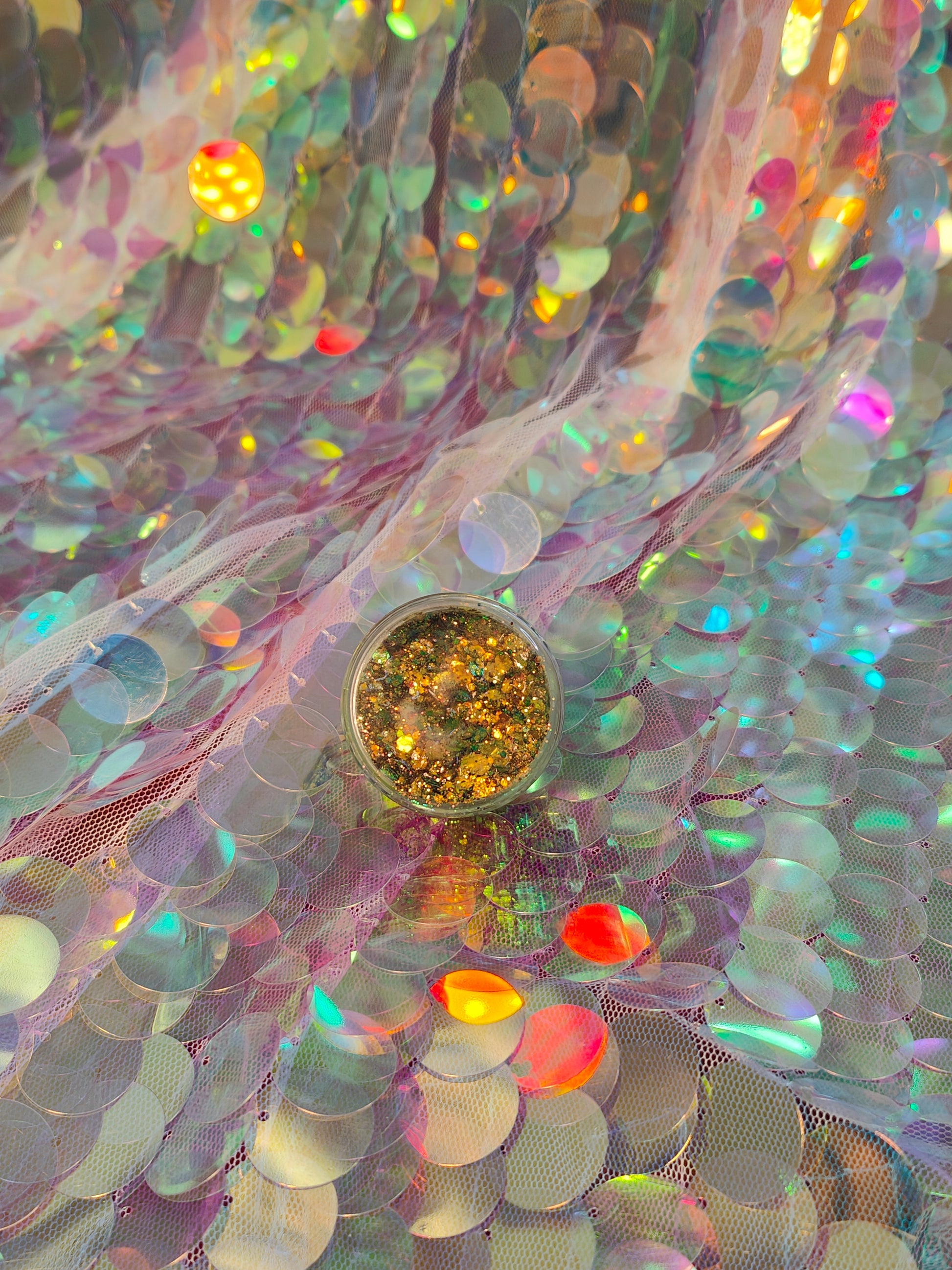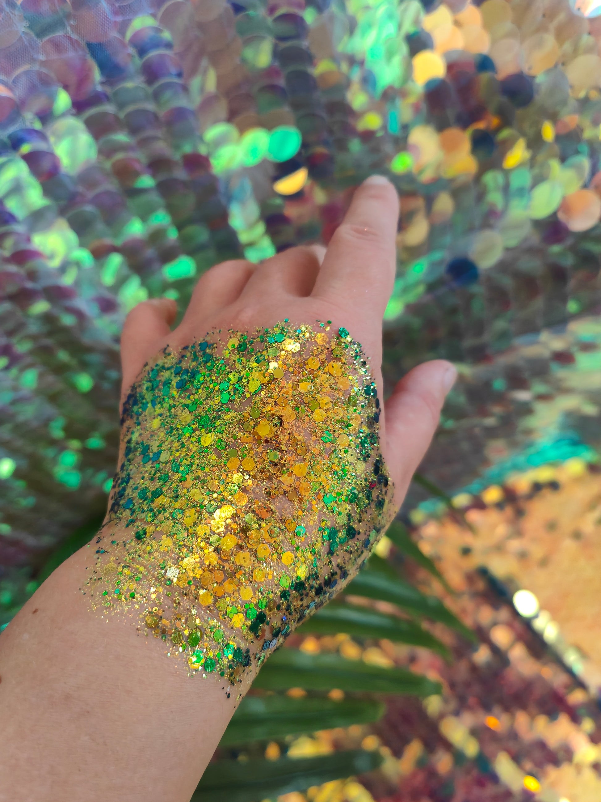Ingredients: Chunky Cosmetic Grade Glitter, Aqua, Cellulose, Dimethicone, Acrylates Copolymer, DMDM Hydantoin.