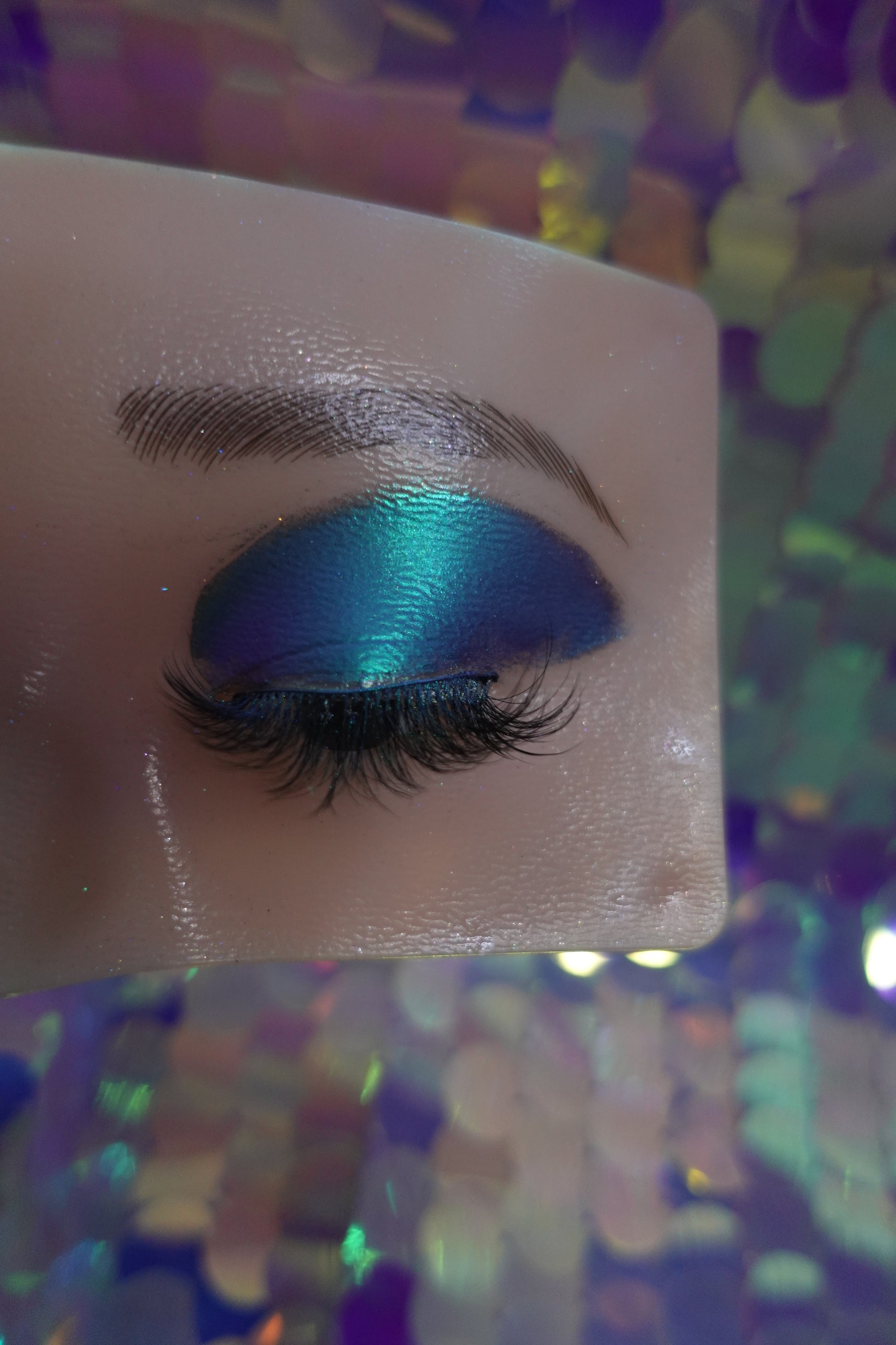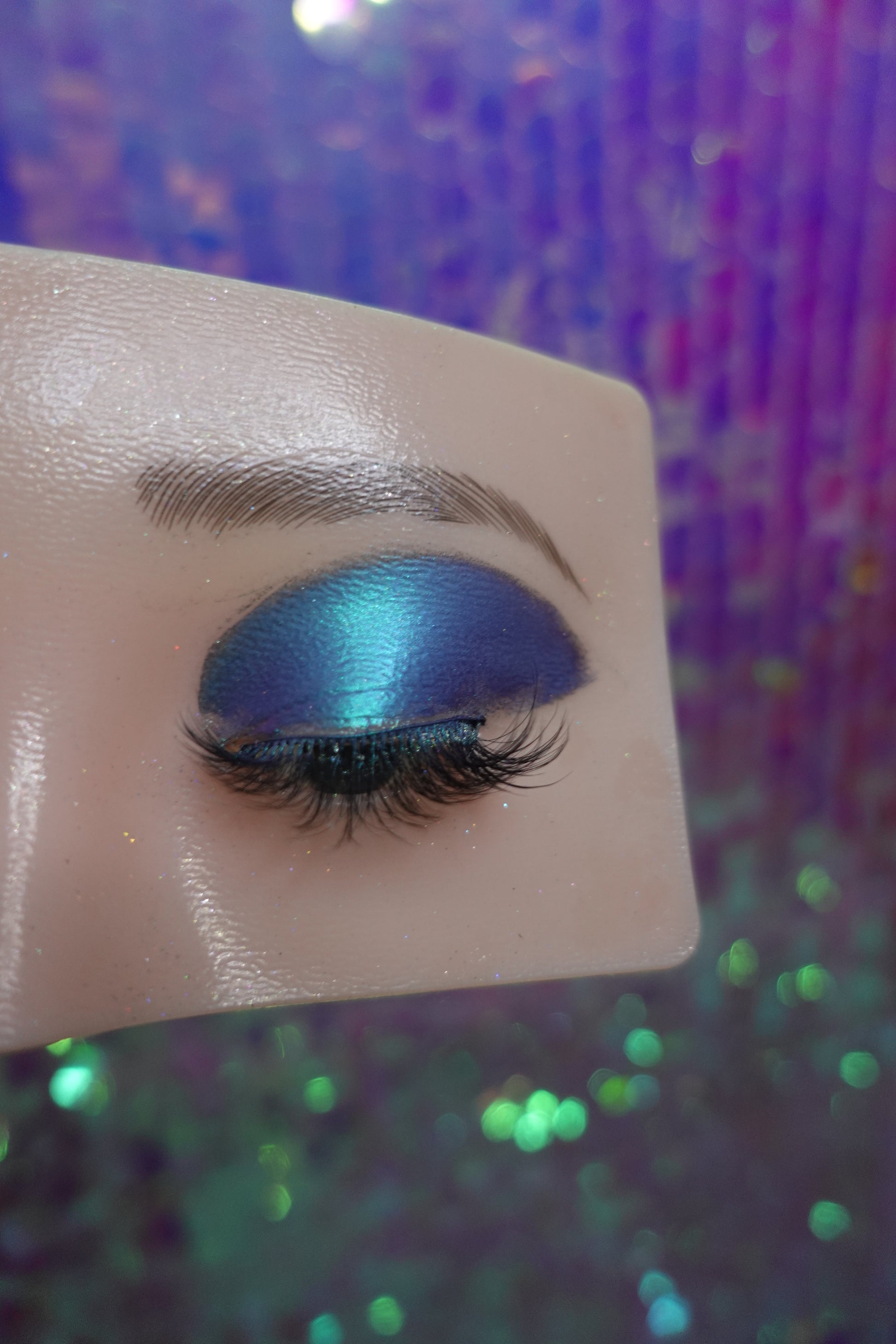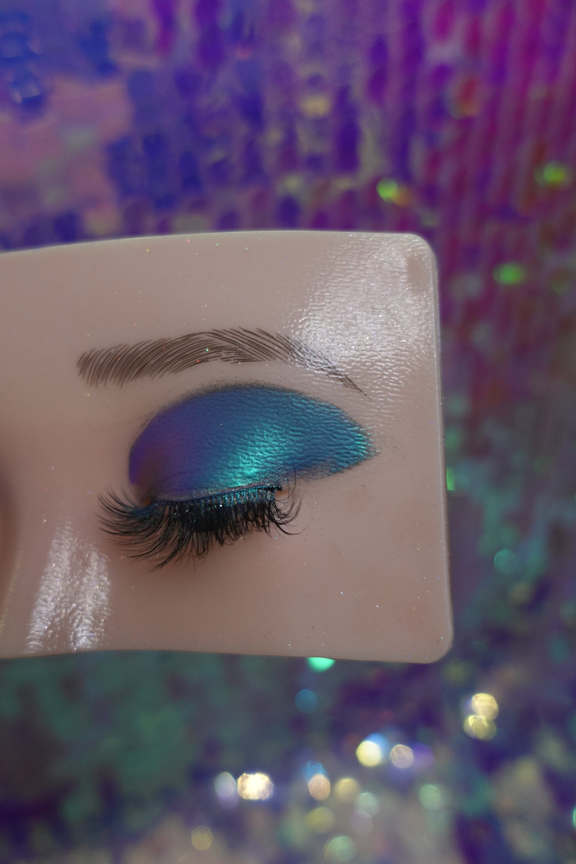 Bold multichrome eyeshadow flashes from vivid green to deep blue with a striking high-shine finish
