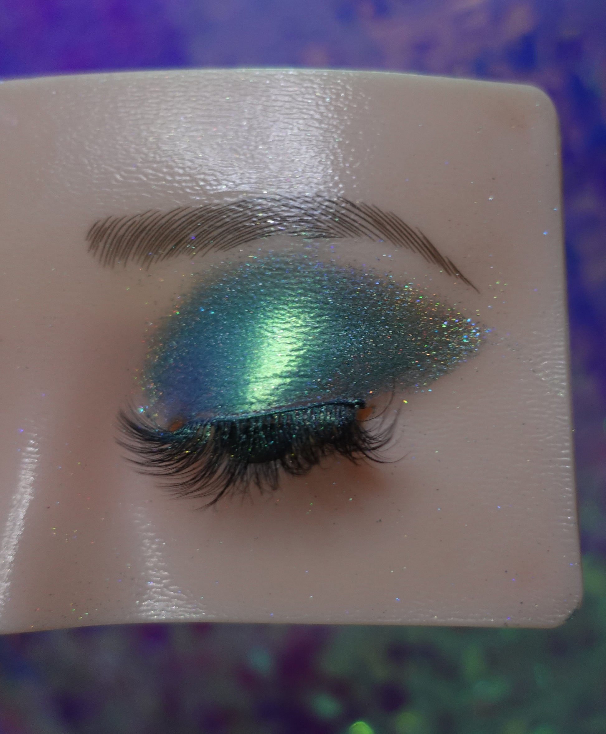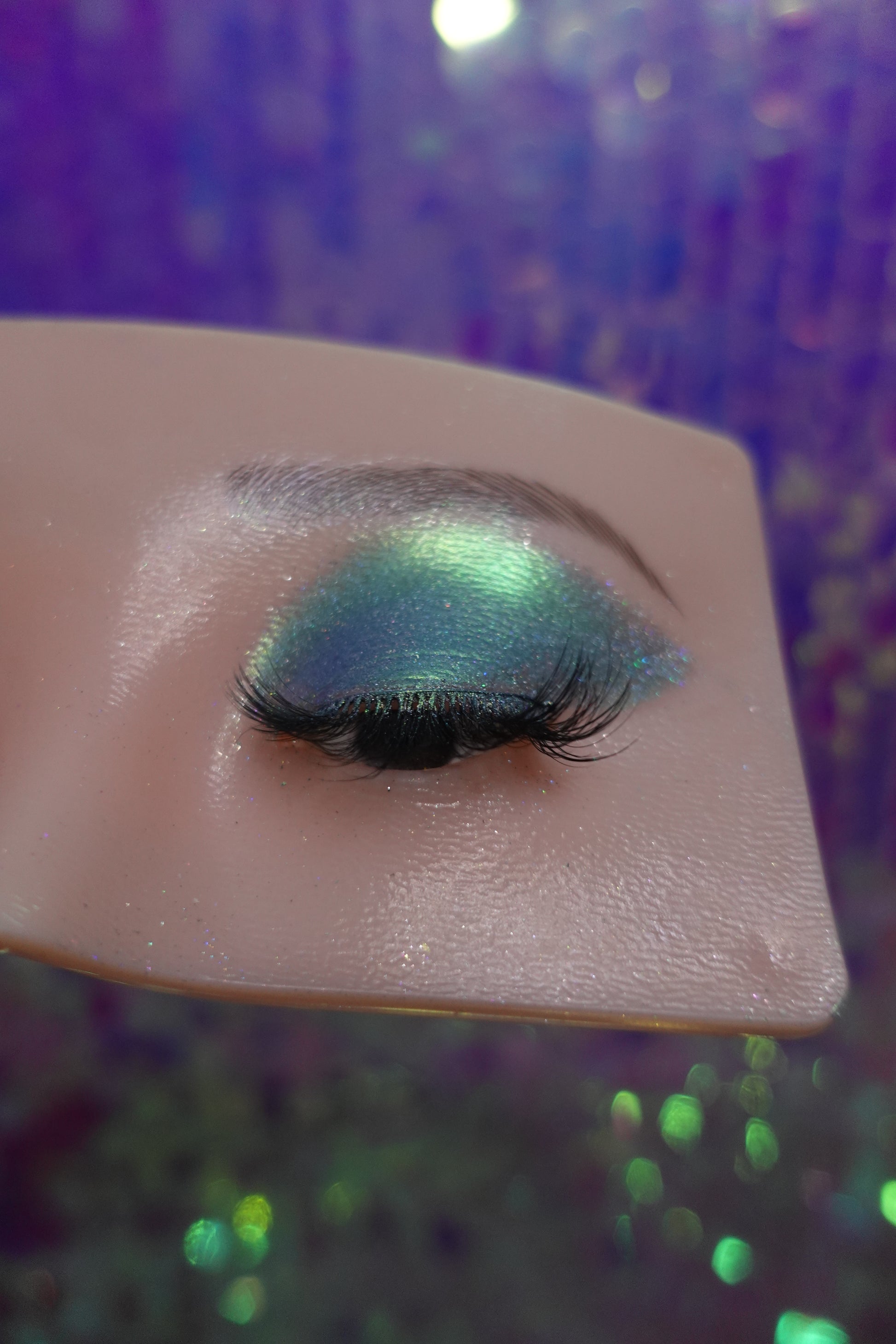 Vivid multichrome eyeshadow shifts from holographic green to electric blue