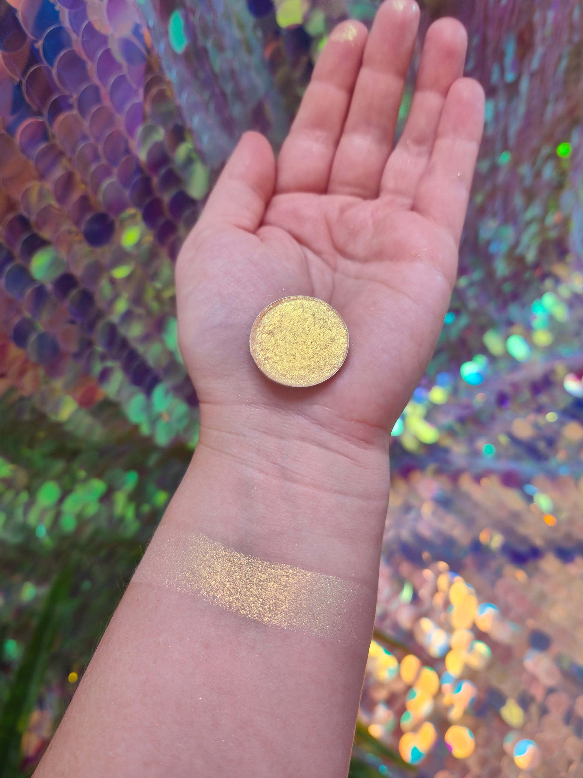 Yellow gold chameleon with delicate pink color shift eyeshadow packed with high-quality pigment. This eyeshadow ensures long-lasting wear that stays put for hours