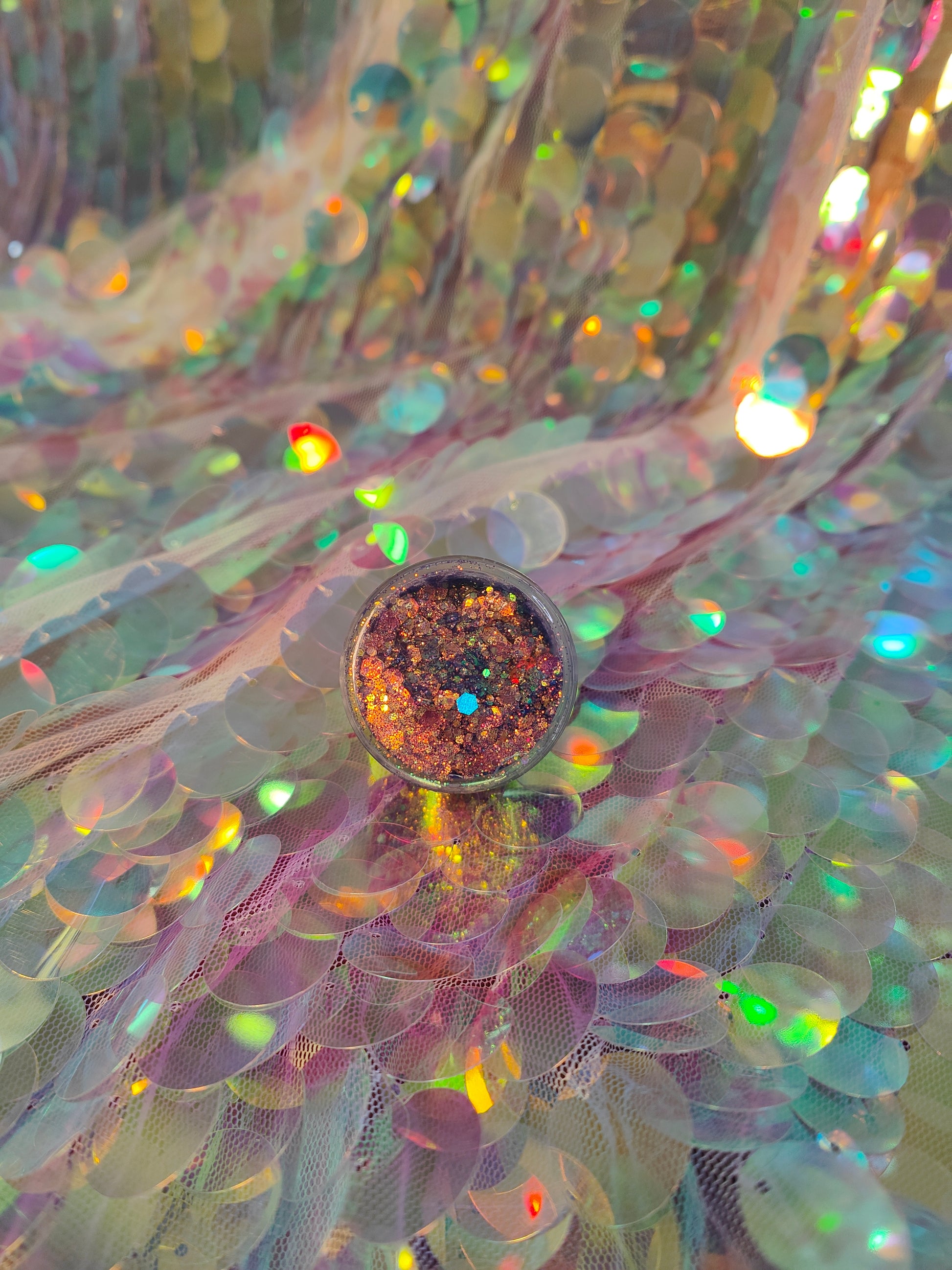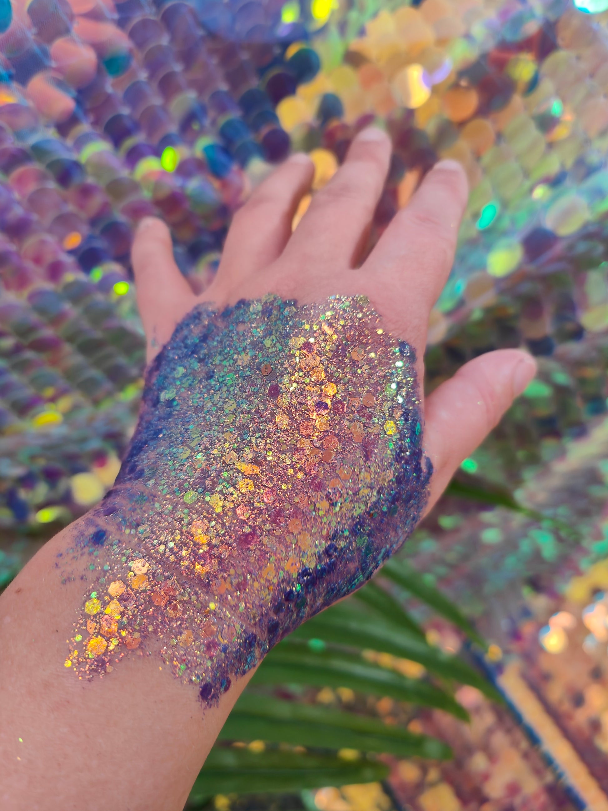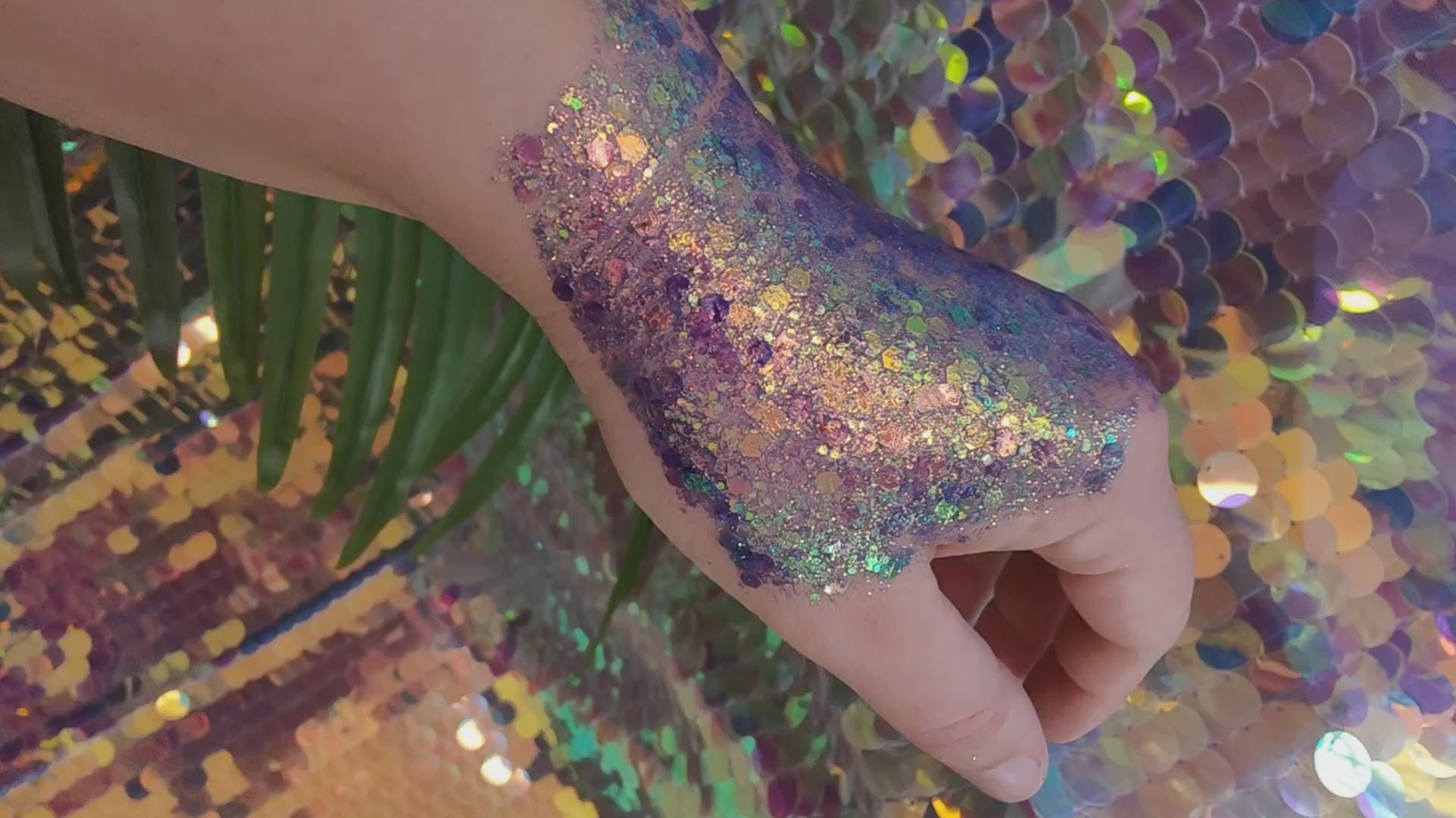 Ingredients: Chunky Cosmetic Grade Glitter, Aqua, Cellulose, Dimethicone, Acrylates Copolymer, DMDM Hydantoin.