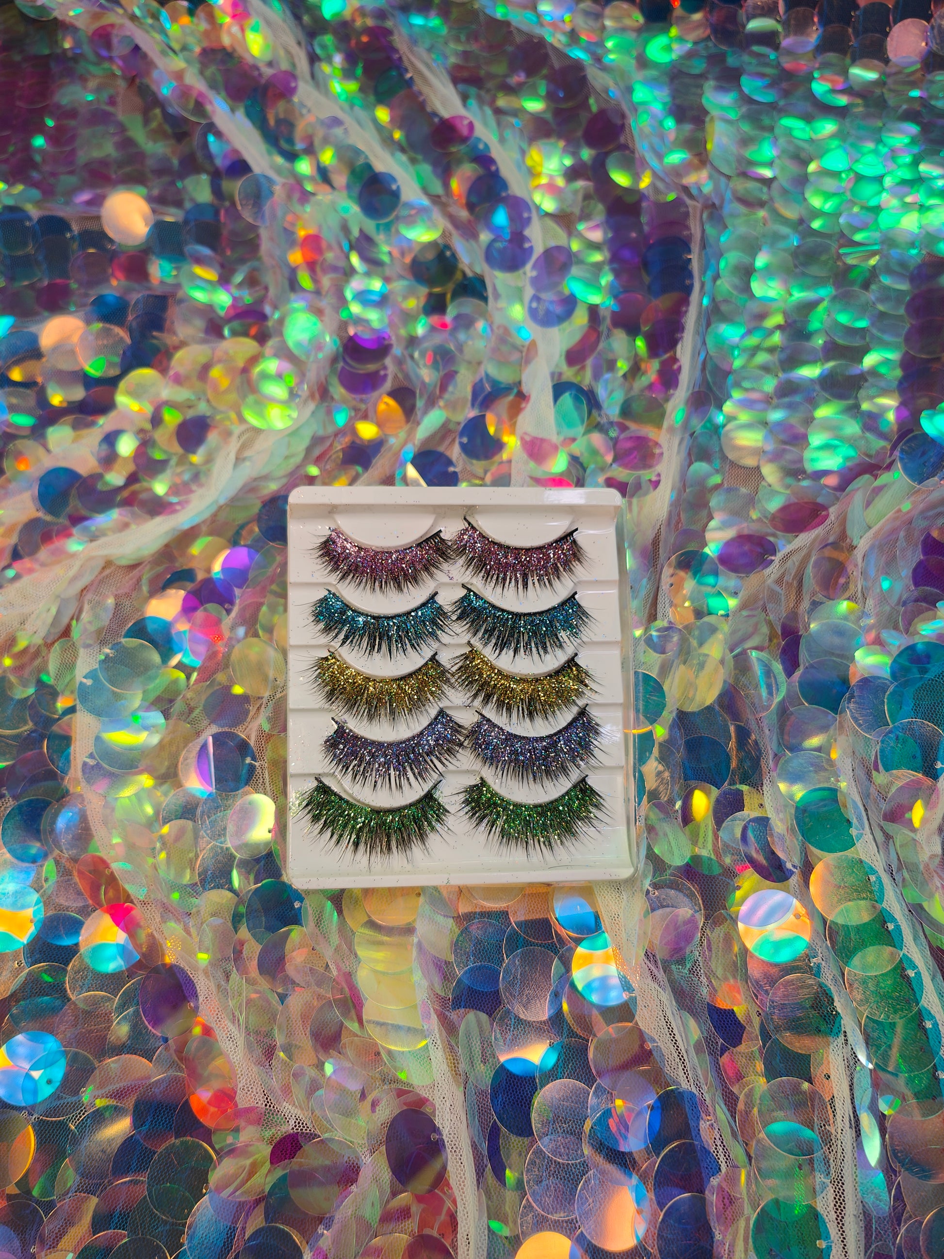 A bundle of five different glitter false lashes to create a unique look and festival feel (random bright colors)